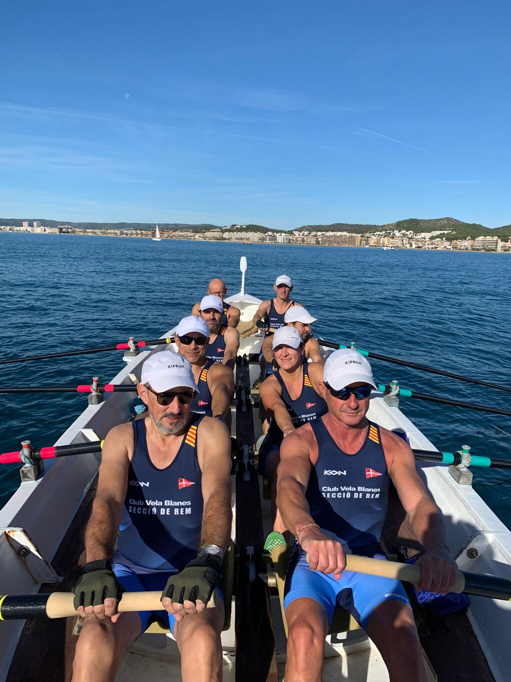 Calafell, domingo 9 de noviembre de 2025.- El equipo veterano masculino de la sección de remo del Club Vela Blanes debutó en su primera regata de la liga de competición, este pasado domingo a Calafell, después de la anulación de las dos anteriores.